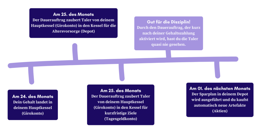 Mit einem einfachen Zauberspruch (Dauerauftrag), kannst du dafür sorgen, dass bestimmte Mengen an Talern (Euro) jeden Monat von deinem Kessel für tägliche Ausgaben (Girokonto), auf magische Weise ganz automatisch in deine anderen Kessel wandern. Eine rote Glaskugel, die dich regelmäßig daran erinnern muss, kannst du dir also sparen.