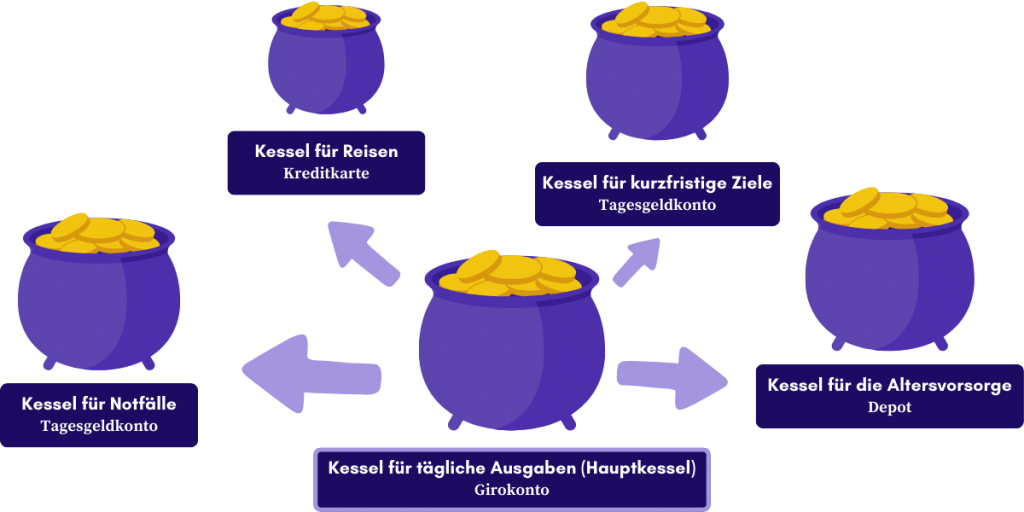 Stell dir vor, du hast fünf magische Kessel, in denen du deine Taler für unterschiedliche Zwecke aufbewahrst. Diese Kessel repräsentieren das 5-Kessel-Prinzip. Das ist eine einfache Methode, um Geld sinnvoll zu verwalten. Jeder Kessel hat einen speziellen Zweck, ähnlich wie verschiedene Zaubertränke für unterschiedliche Anwendungen genutzt werden.
