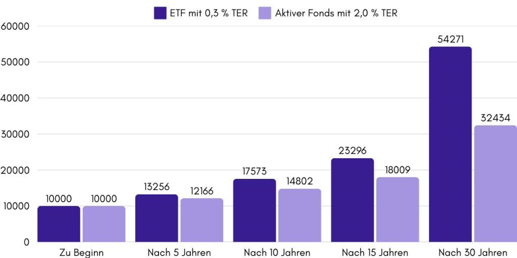 Nehmen wir an, du hast 10.000 Taler in einen ETF mit 0,2% TER investiert. Dann bezahlst du pro Jahr 20 Taler (Euro) an Gebühren. Diese werden übrigens direkt mit deiner Investition verrechnet, du musst keine zusätzlichen Taler (Euro) bezahlen.